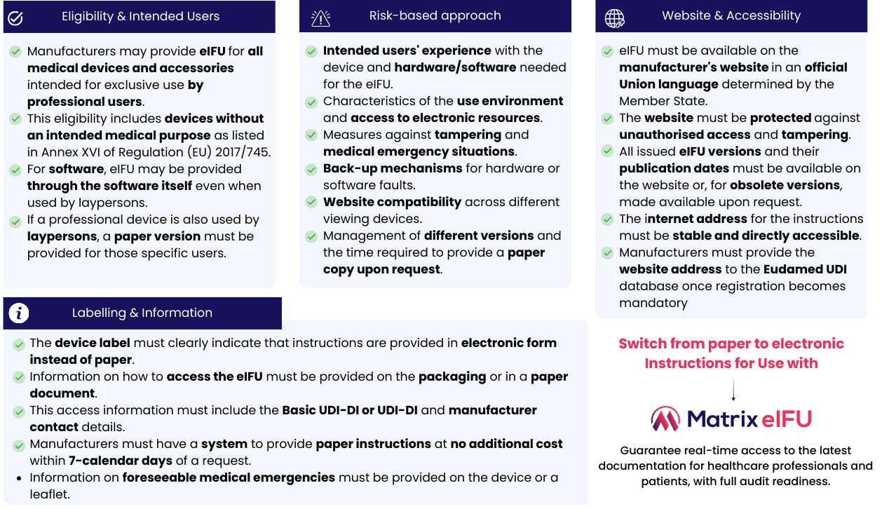 | Device eligibility | Art. 3, (EU) 2025/1234 | Verify that the device is intended for professional use only. If lay users are involved, a paper version remains mandatory in the packaging. |