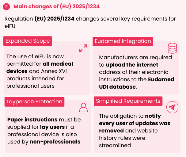 | (EU) 2025/1234 | Expanded the scope to allow electronic instructions for all medical devices intended for professional users and introduced the requirement to provide the website address to the Eudamed UDI database. |