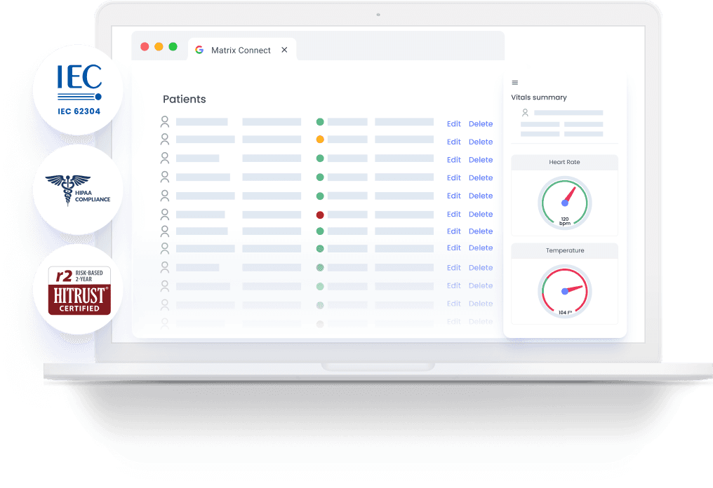 Yes. Matrix Connect is built under an ISO 13485 certified quality management system and operated under HITRUST certified controls, with full alignment to IEC 62304, HIPAA, GDPR, FDA, and EU MDR requirements.