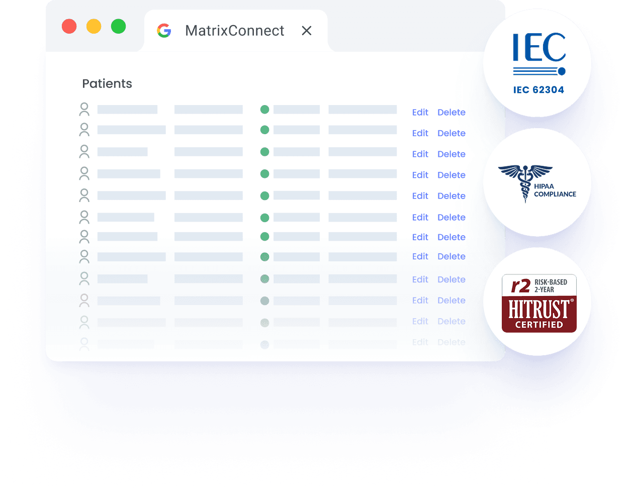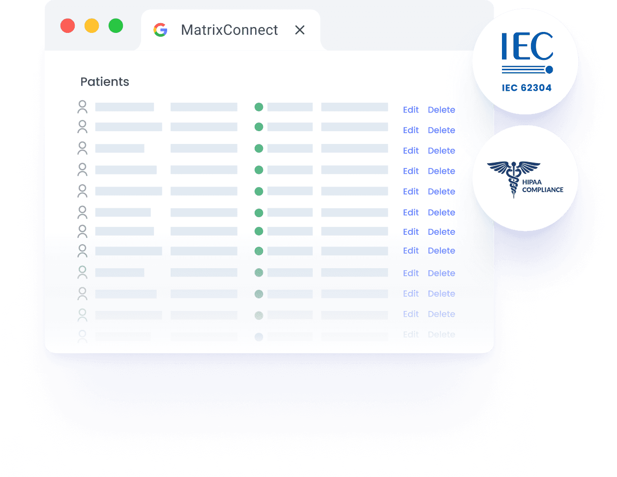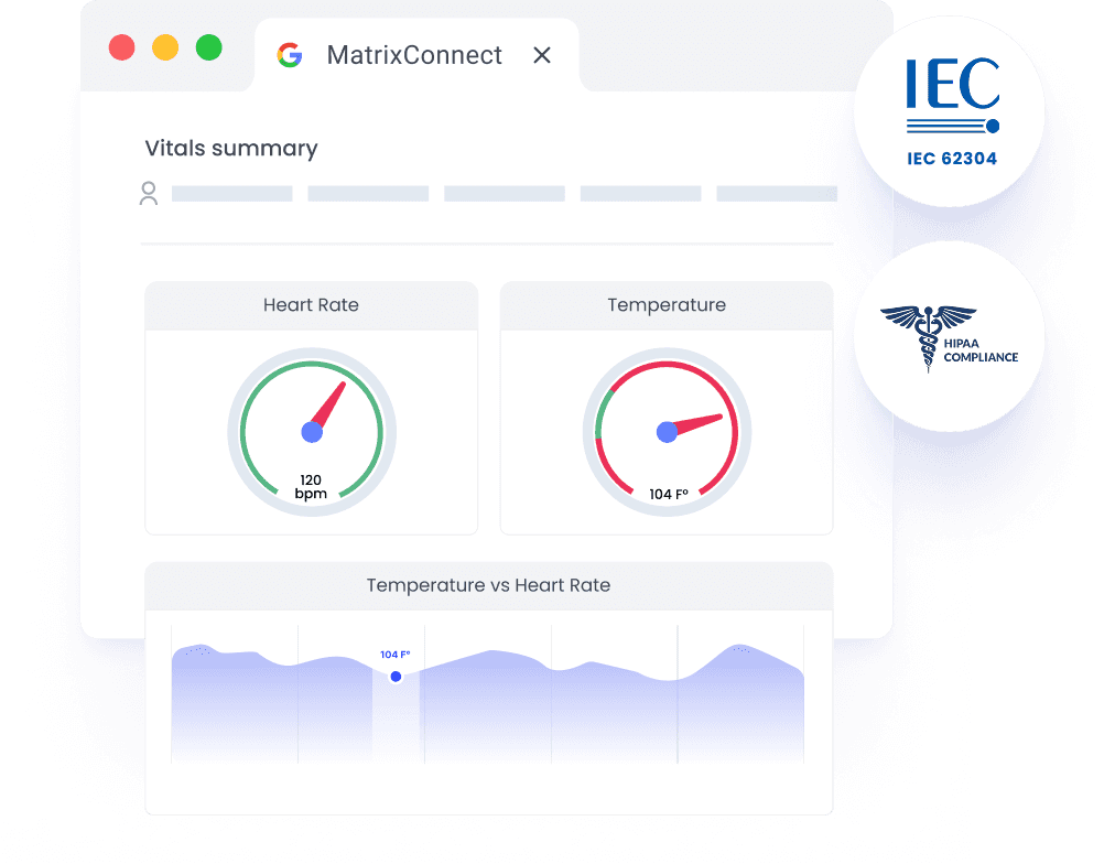 Matrix Connect collects and securely stores data from your devices — with full IEC 62304 and HIPAA/GDPR compliance.