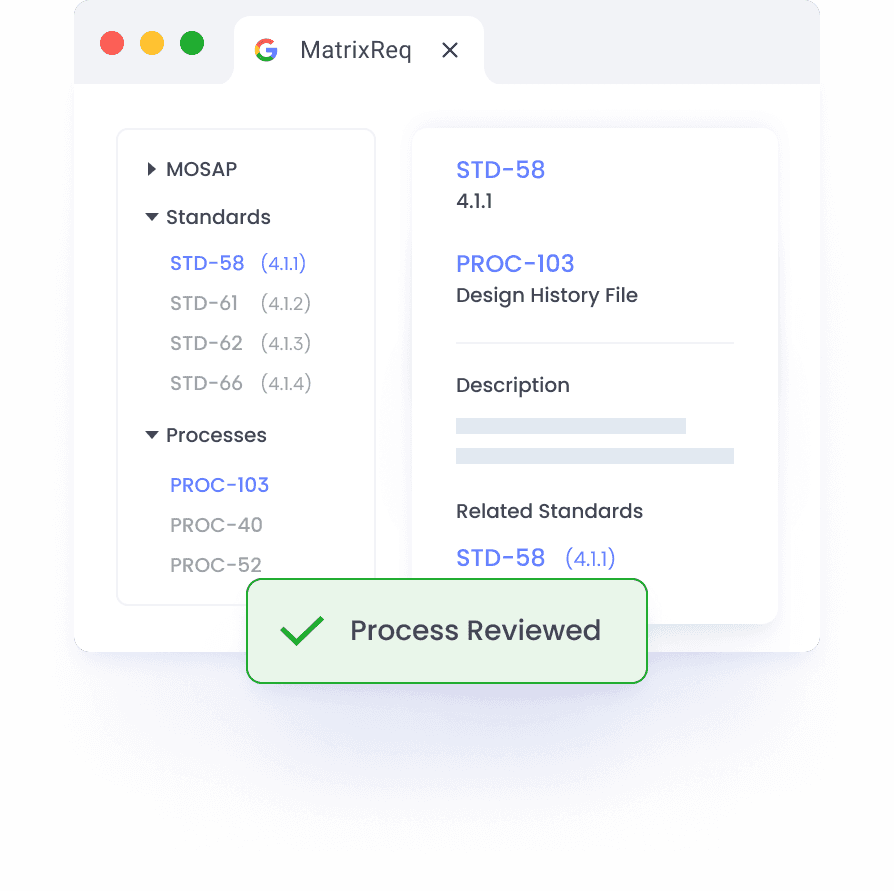 Capture, document, and manage all design requirements, design outputs and verification/validation tests in a centralized repository making it easy for teams to access, review, and update them throughout the product lifecycle.